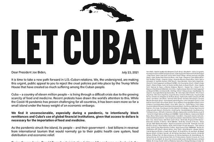 O documento, accesíbel no enderezo https://www.letcubalive.com/, recolle firmas como a da historiadora británica Helen Yaffe, o xornalista galego Ignacio Ramonet, o premio Nobel da paz Adolfo Pérez Esquivel, os expresidentes Lula da Siva e Rafael Correa ou o que foi rector da UNAM, Pablo González Casanova, o lingüista Noam Chomsky, ou o expresidente brasileiro Luiz Inácio Lula dá Silva; Tamén suscriben o texto, Jeremy Corbyn, o reverendo Jim Winkler, do Consello de Igrexas de Estados Unidos, o teólogo brasileiro Frei Beto ou as actrices e actores estadunidenses Danny Glover, Susan Sarandon, Jane Fonda e Mark Ruffalo, e organizacións como Codepink e Black Lives Matter. Desde outros lugares, avalian o documento Yanis Varoufakis, Santiago Alba Rico e Emma Thompson.