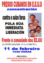 A Asociación de Amizade Galego-Cubana Francisco Villamil, chama á participación de tódolos anti-imperialistas do noso país á concentración que terá lugar o vindeiro sábado 11 de febreiro, ás 13 horas, diante do edificio que alberga o consulado dos Estados Unidos na rúa Cantón Grande número 6 (A Coruña) para denunciar a situación dos 5 prisioneiros políticos cubanos nos Estados Unidos de América.