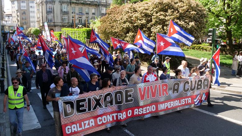 É tradición en Galiza a irmandade e atención coa Cuba bloqueada dende hai 66 anos, nunha continuidade na que participan a solidariedade e sindicatos e partidos e que no meiodía de sábado 19 revelou unha notoria capacidade de mobilización en Compostela: atrás dunha banda de beira a beira que conminaba ao imperialismo a respectar o dereito de Cuba a se gobernar sen bloqueo: “Deixade vivir a Cuba: contra o asedio imperialista”. Unha onda de bandeiras cubanas ao vento definía o fondo de imaxe da cabeceira.
