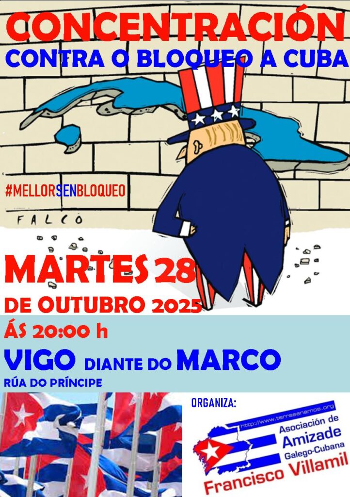 A manífestación en defensa de Cuba e contra a intromisión que o goberno de Washington recrudece dende Rio Bravo e o Caribe ao Cabo de Fornos, terá lugar na Segunda Feria 28 de outubro, ás 20:00 horas diante do MARCO de Vigo.